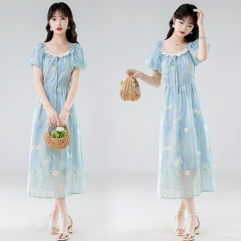 hmwl9923 花柄シフォンドレス女性 2025 夏の新しい海辺の休暇気質ブルーの新鮮なスカート