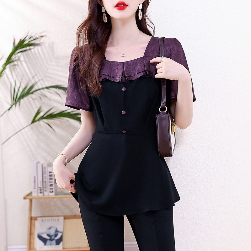 Yml 1345大きいサイズの婦人服2025夏の新型の気質のフランスのシャツの太っているMMは身を修めてやせている半袖の上着を現します。