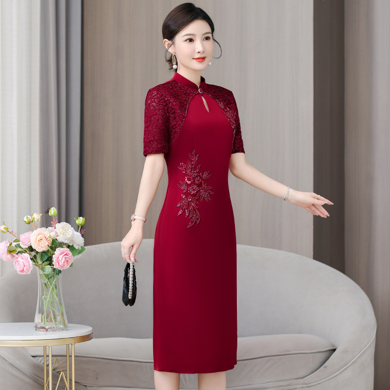 Nrm7016赤い喜婆披露宴のチャイナドレス2025夏の新型レースのレトロな洋風ワンピース