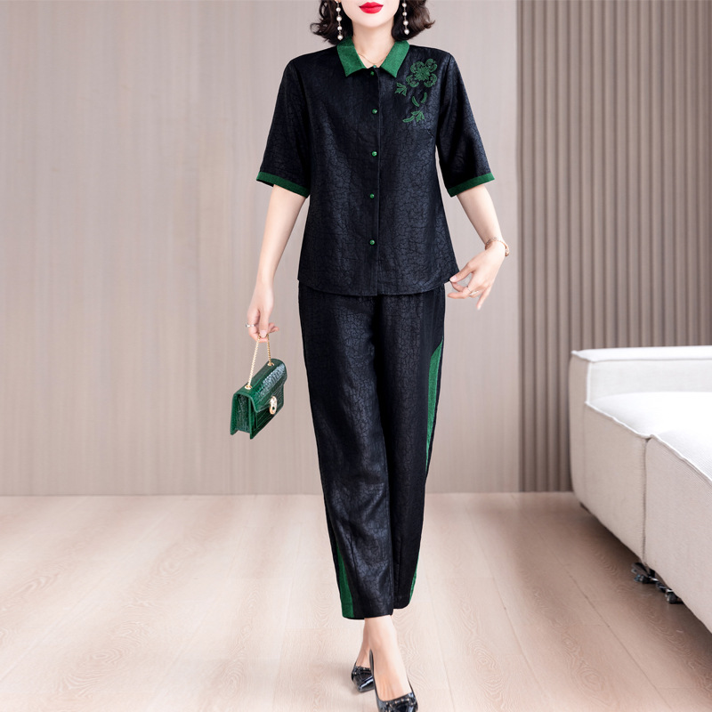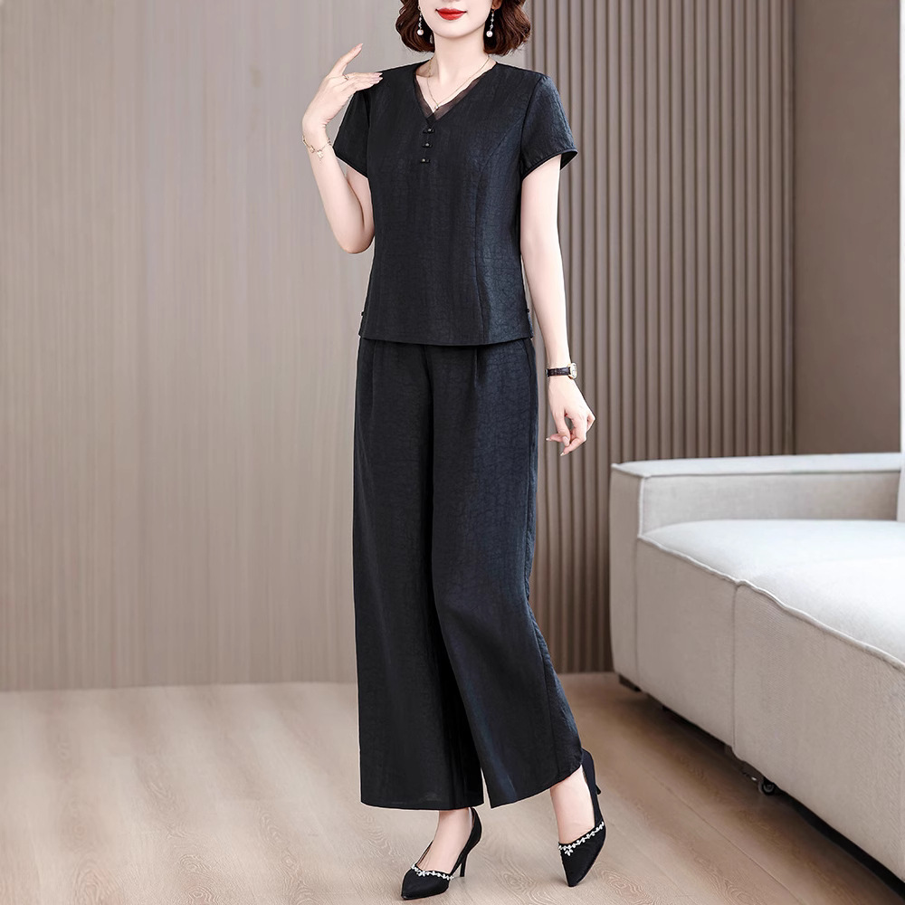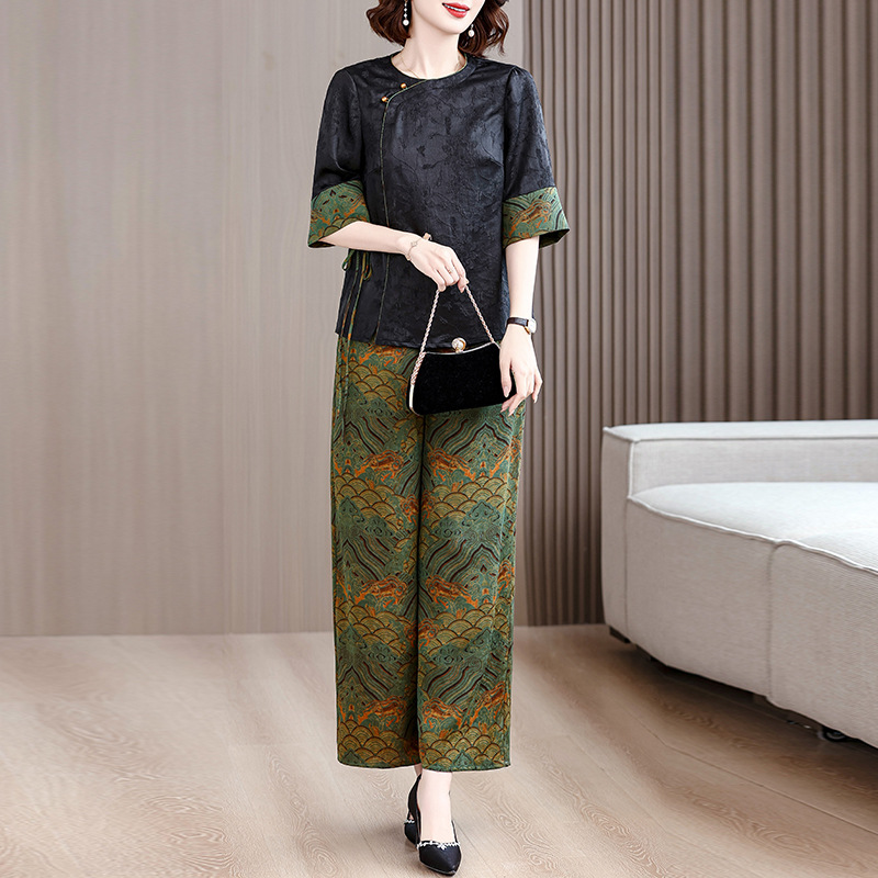 Qyfs 8003新中国式ママセット2025夏の新型気質ファッション黒シャツワイドパンツの組み合わせ