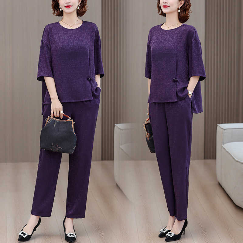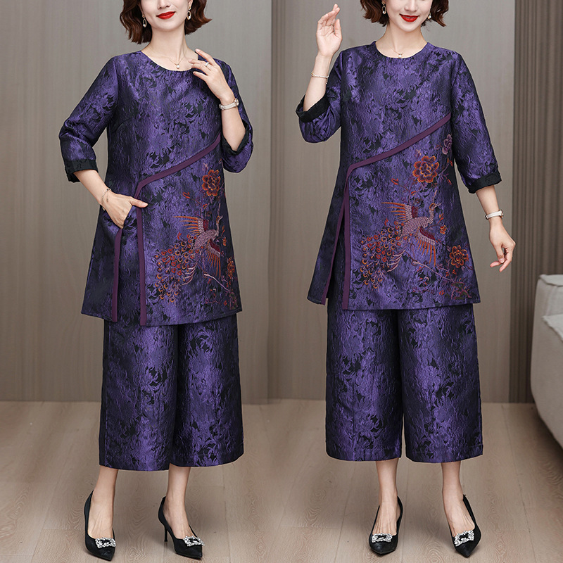 Blx9670ゆるいファッションママ服レトロジャカード上着ワイドパンツ2点セット2025夏新作