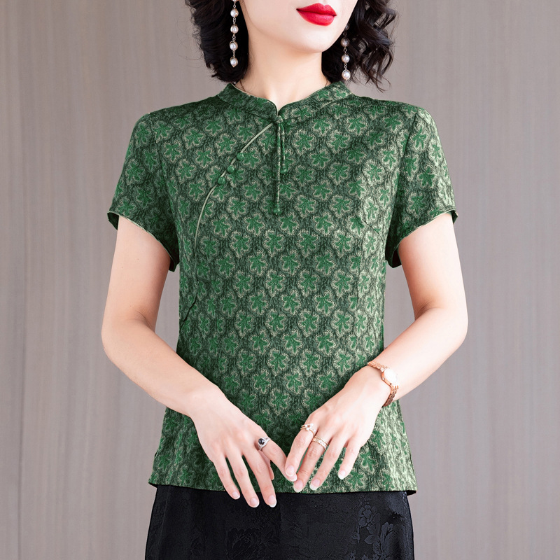qyfs8989 レトロバックルスタンドカラートップ女性のための 2025 夏薄い中年母親花柄シャツ半袖