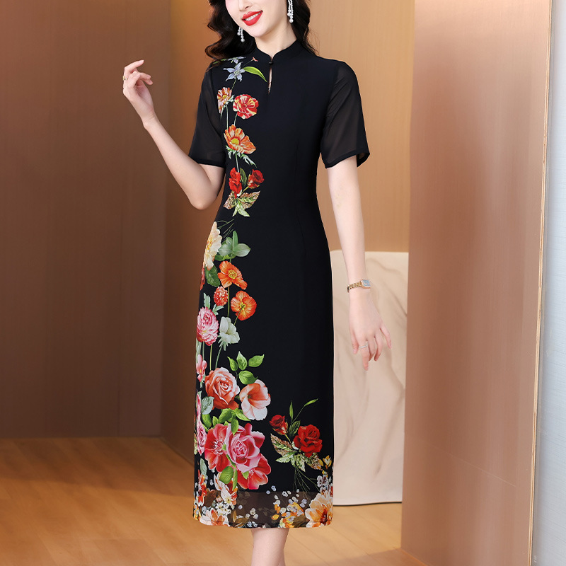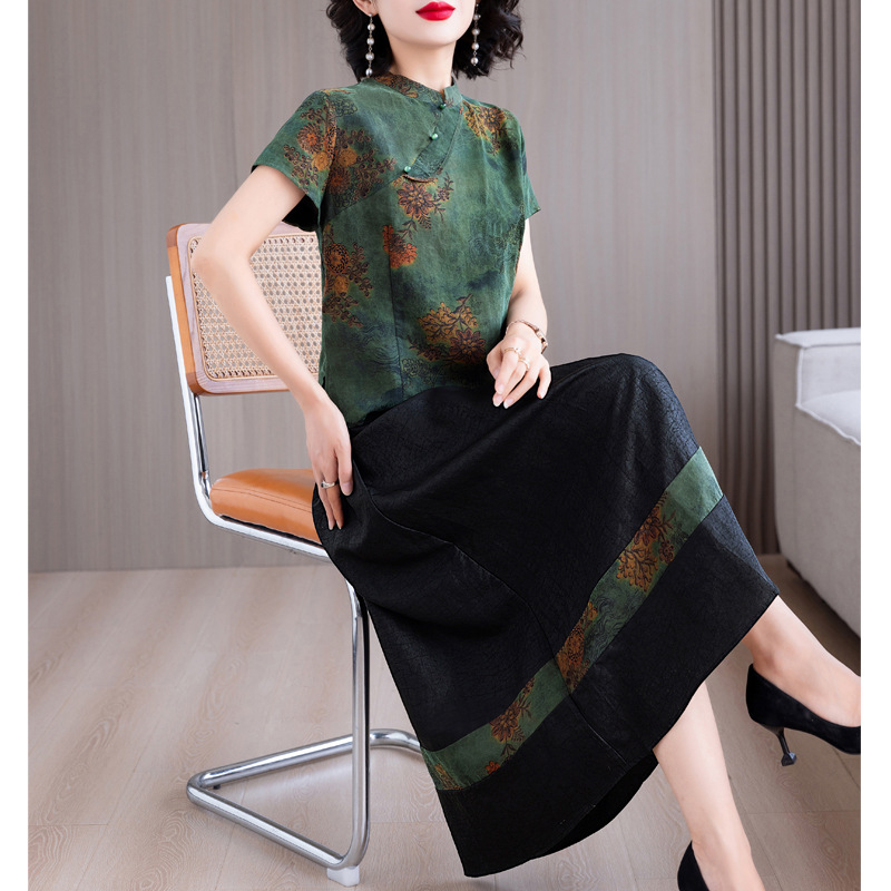 Gwe7615新中国式レトロプリント旗ガウン襟ワンピース女性2025夏新作気質優雅ロングスカート