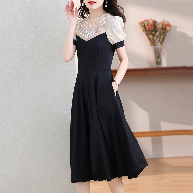 Gwe7363大きいサイズの婦人服2025夏の新型ファッション減齢高級感のある名媛釘珠ワンピース