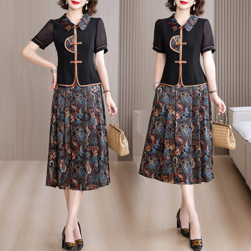 Qyfs 8903新中国式セットのプリントスカート2025新型のお母さんの服装の気質の優雅なシャツの半身のスカートは組み合わせます。