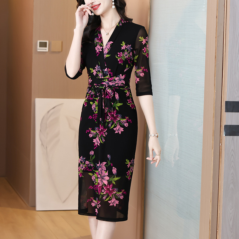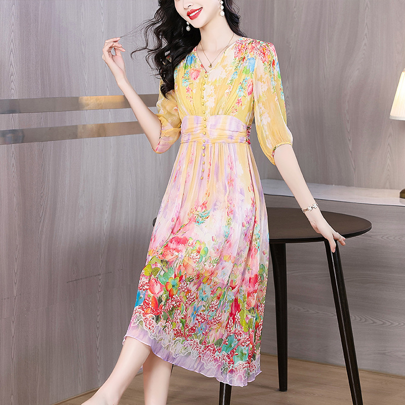 Ssys 7209ファッションレトロ花のワンピース女性2025夏の新型vネック洋気母減齢a字スカート