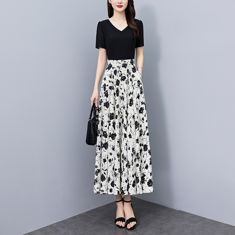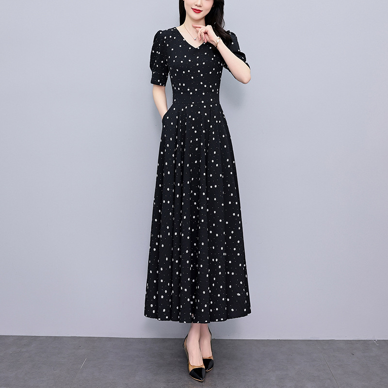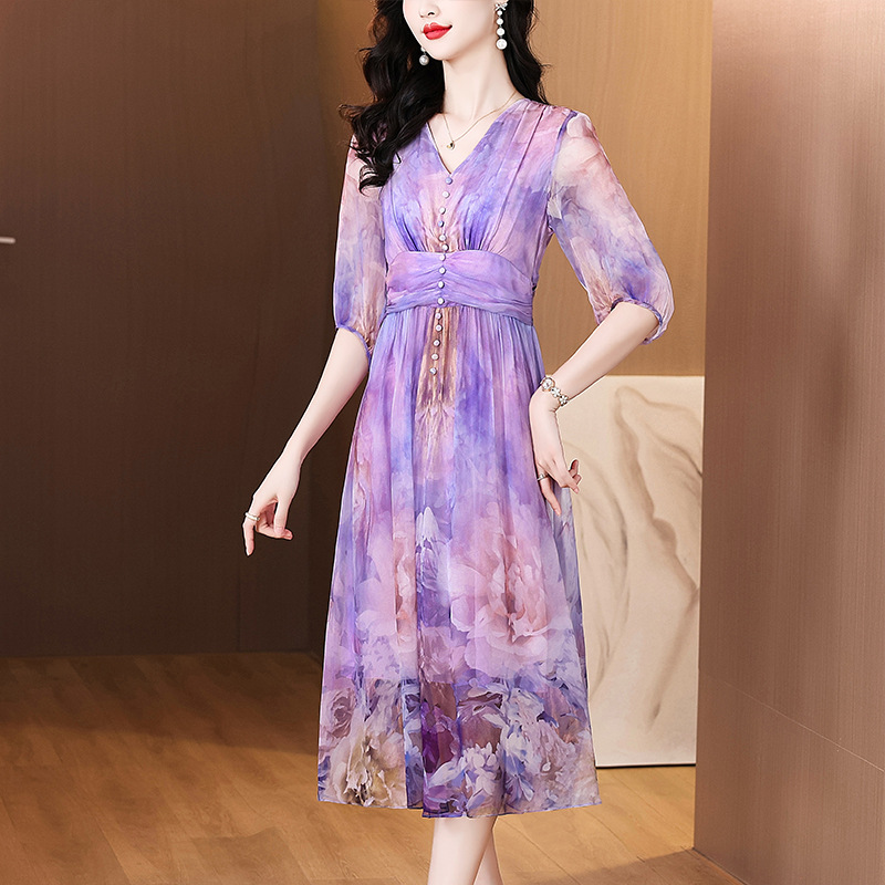 Zyfs 3995フランスvネックウエストプリントワンピース女性2025夏の新型ファッション減齢中ロングスカート