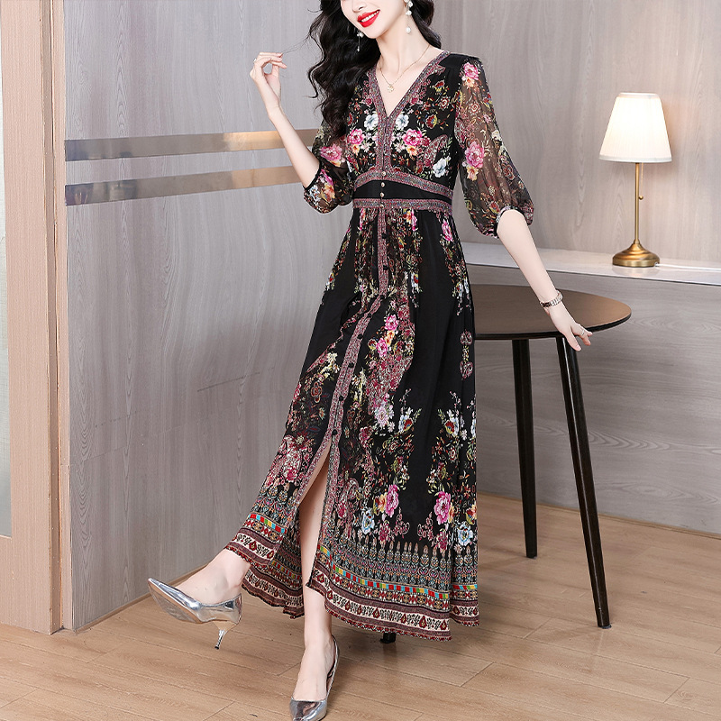 Zyfs 3933リゾート風デザイン感vネックプリントウエストワンピース女性2025夏新作ロングスカート