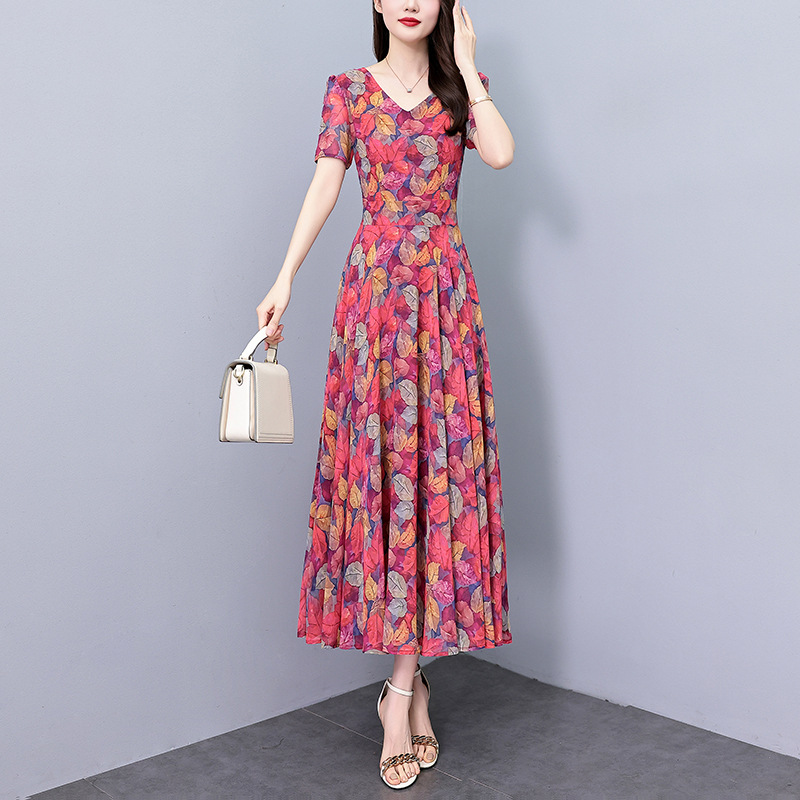 Lzl7572シフォンピンクの花のワンピース女性2025夏の新型の大きいサイズの太ったmmは腰を収めてやせているロングスカートを現します。