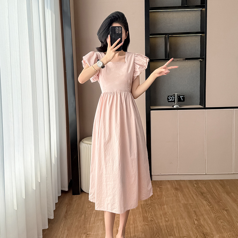HmgS607方襟ワンピース女性夏泡袖フランス気質ゆるい着痩せ交差露背ロングスカート