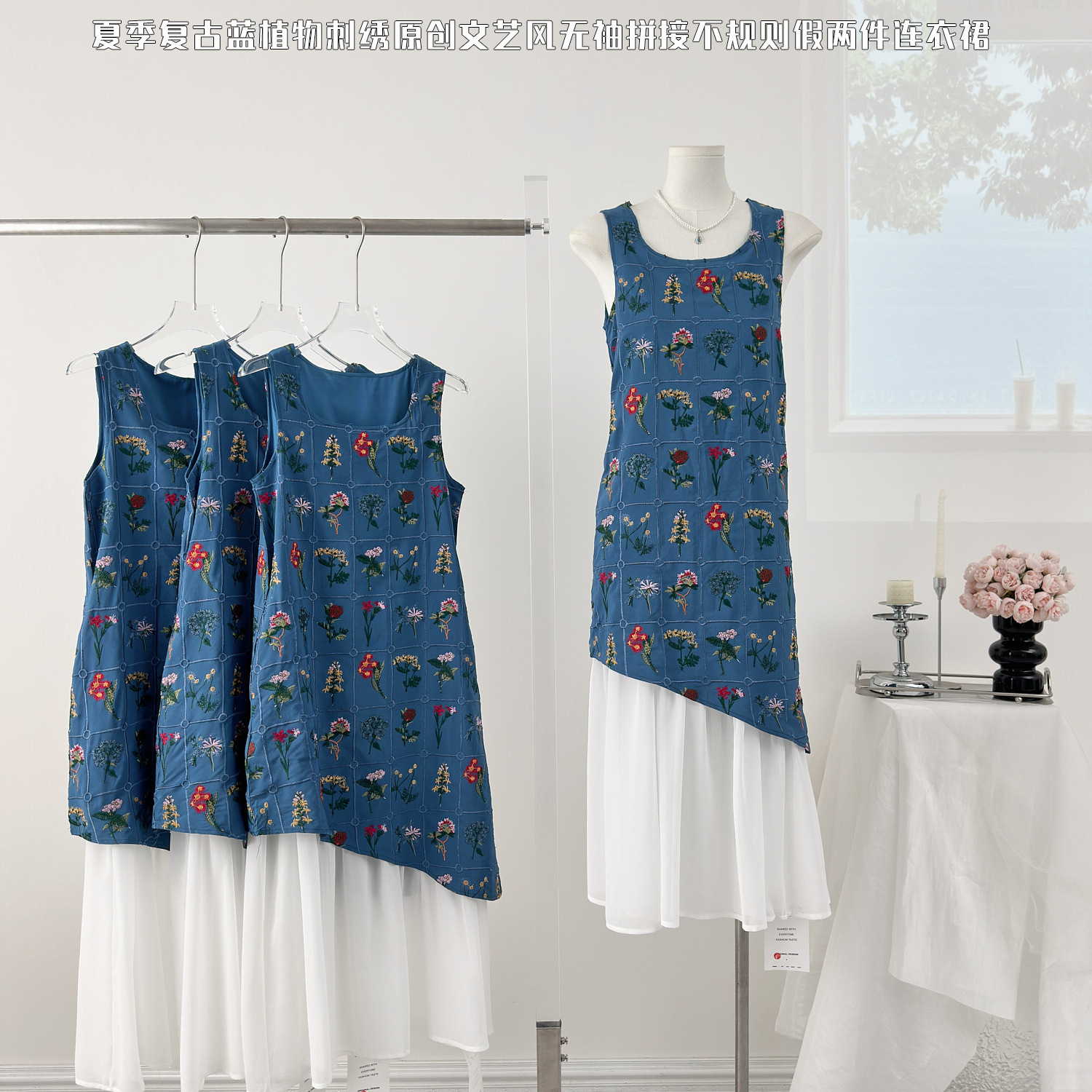 Tt 5629花刺繍ブルーワンピース女性2025夏の新型リゾート風は偽のロングスカート2枚をつなぎ合わせます。