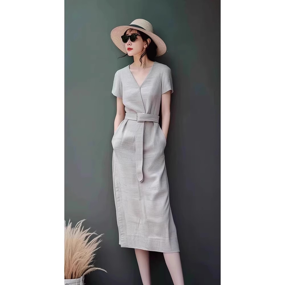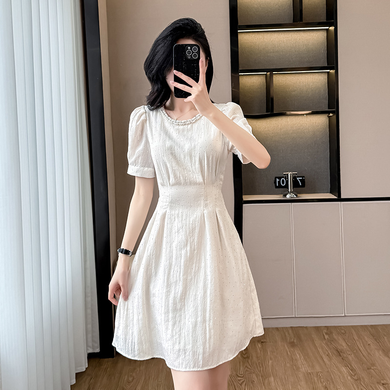 Xl fs 5899優雅な気質は腰を収めてやせていて、肩の半袖のワンピースの女性2025夏の新型の中で長いスカートがあります。