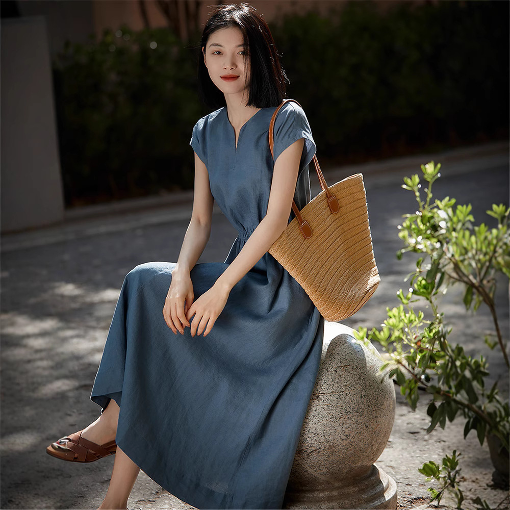 Fls3966水墨の竹のプリントのワンピースの女性2025夏の新型の優しい風の丸首はやせている中で長いスカートを現します。