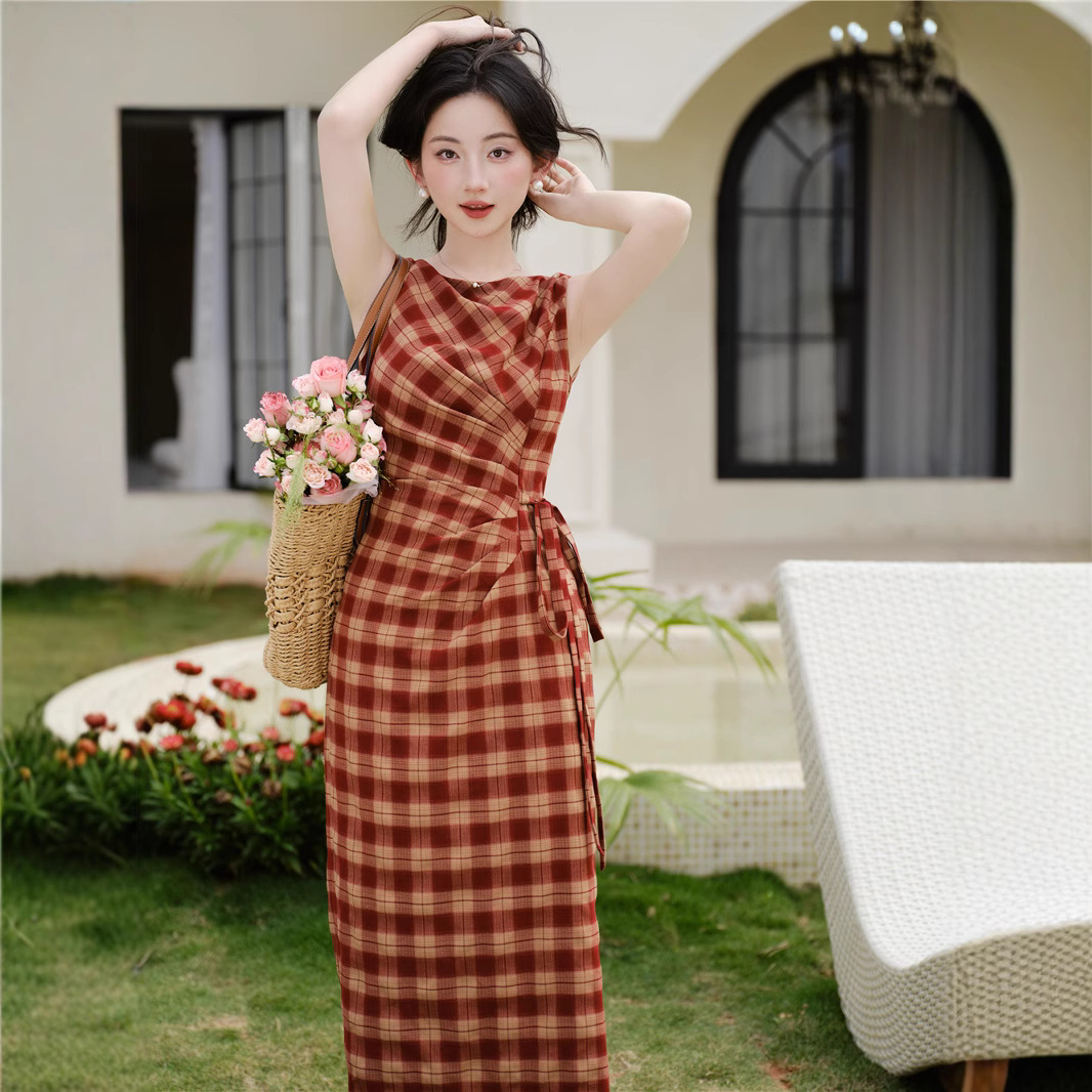 Ycfs1377フランス式ロマンチックなレトロな一字襟の格子縞は腰を収めて尻の赤いワンピース2025の新型のスカートを包みます。