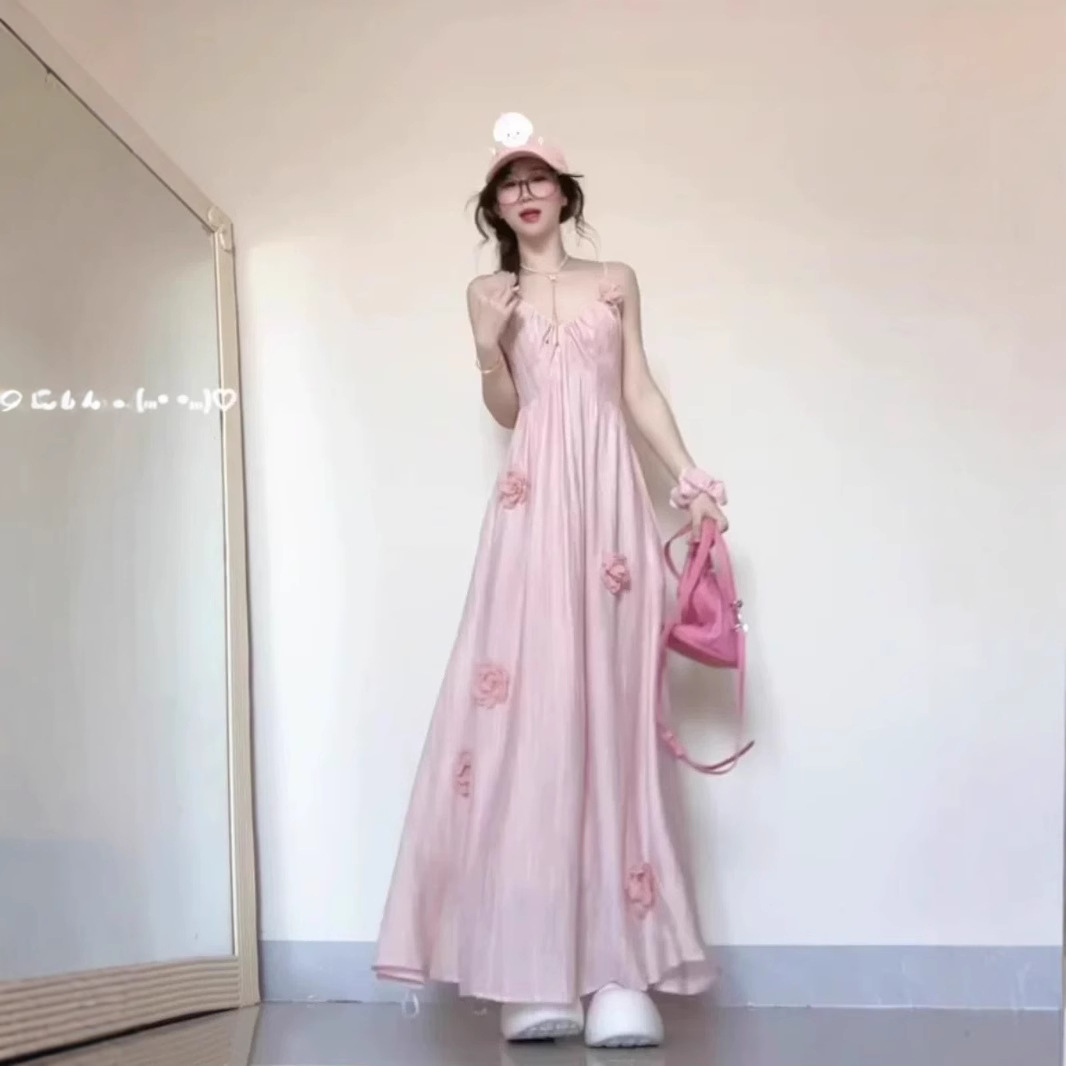 Tt5530ピンク立体花ストラップワンピース女性2025夏甘い海辺休暇小衆ロングスカート