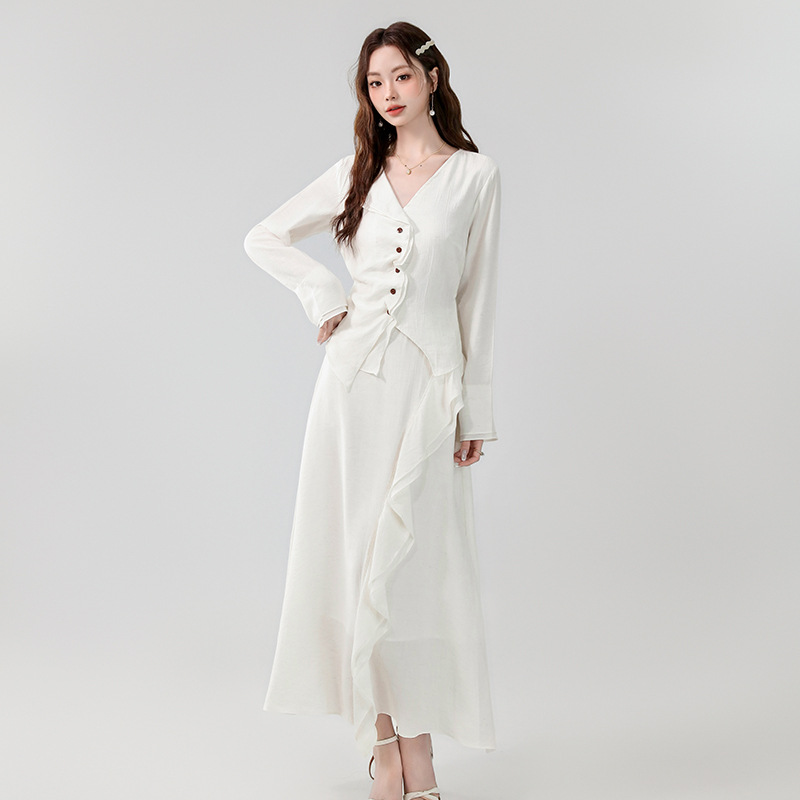 Ml102春夏新作フランスvネック純色のハスの葉の縁の高級デザイン感が現れます。