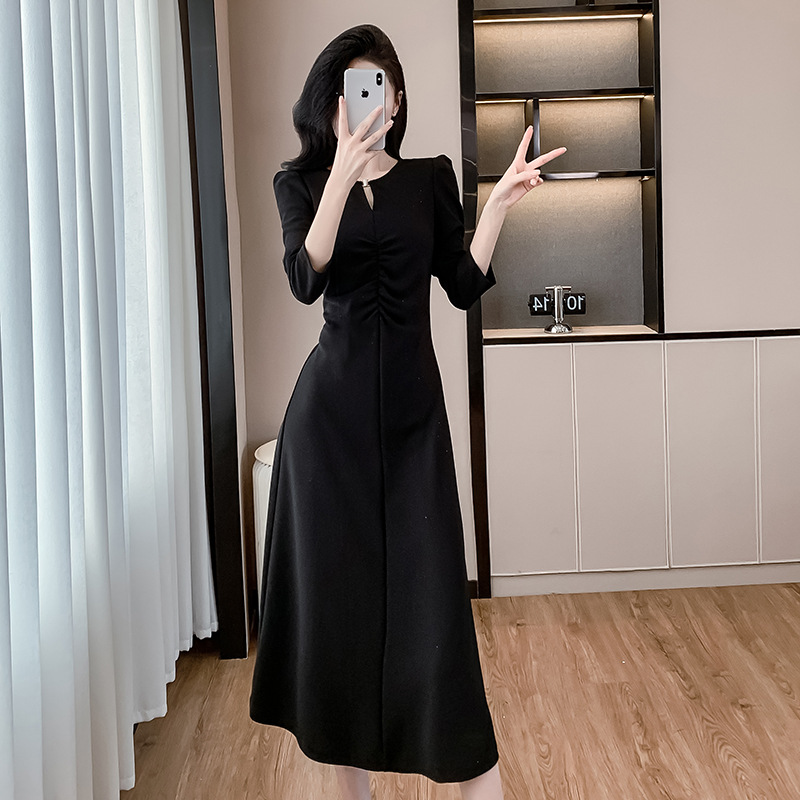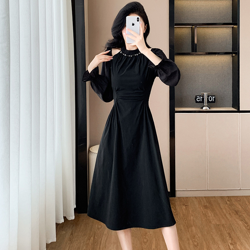 Xm ss 1758ヘボン風気質首の小さい黒いスカートの女性の高級感が肩を現して腰のしわのa字のワンピースを収めます。