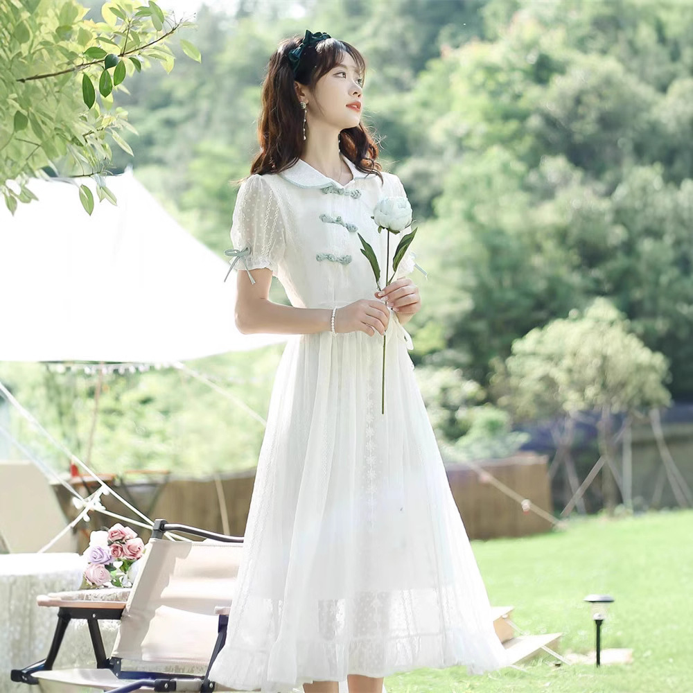 Ysg5112夏の小清新文芸国風児童襟甘い淑女ワンピース復古盤ボタンa字スカート