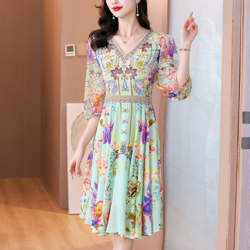 Xxnz6553フランスリゾート風デザイン感vネックプリント長袖ウエストワンピース減齢a字スカート