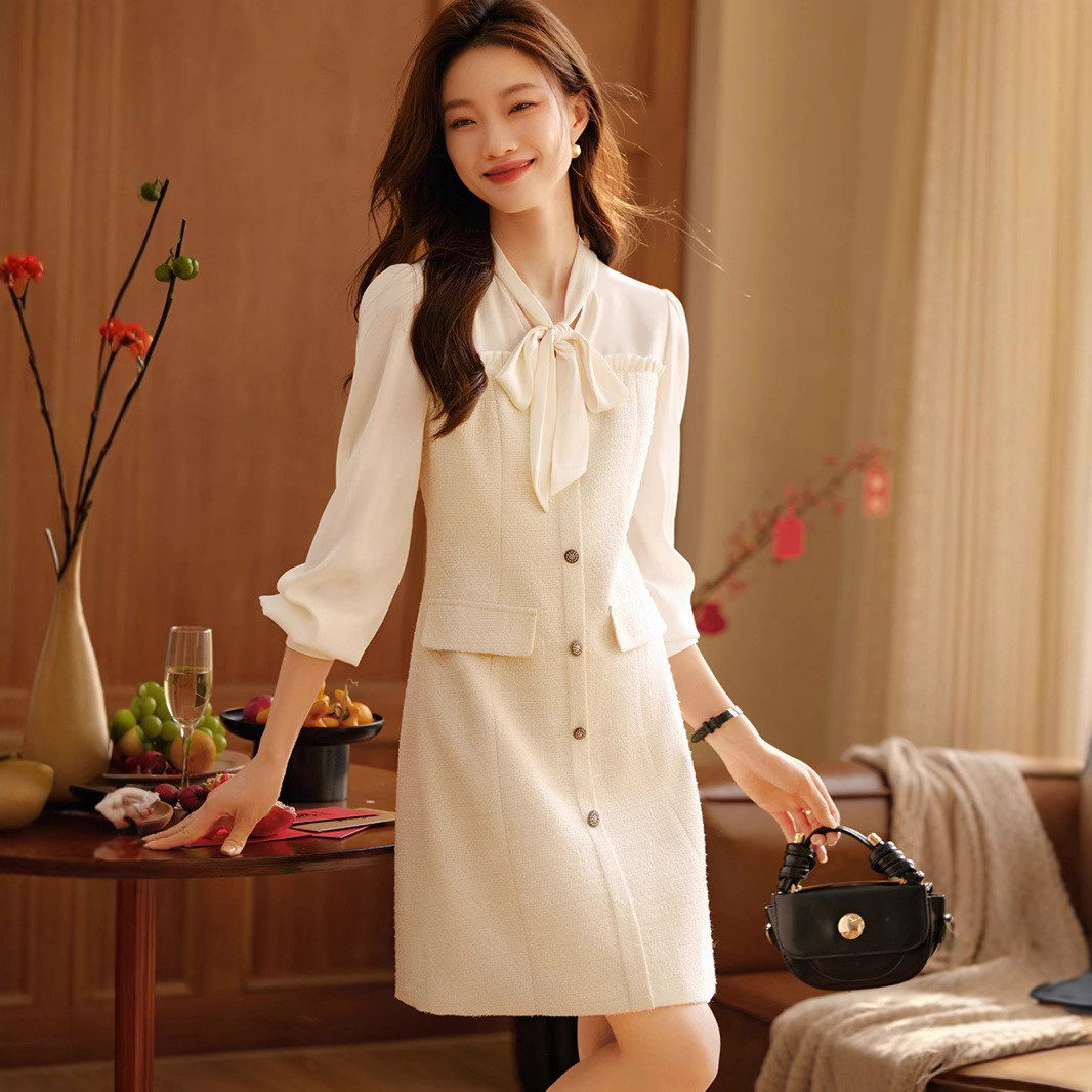 Xl fs 5866蝶結びの気質のワンピース2025春の新型のフランス式の香風は腰を収めてやせているa字のスカートを現します。