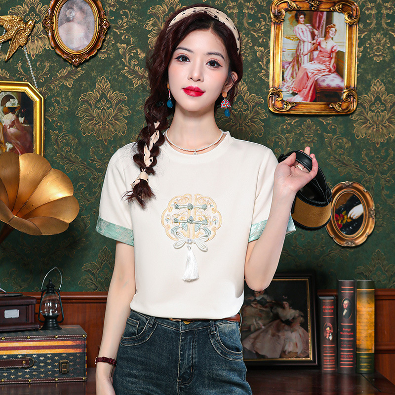 Xm ss2631夏気質新中国風国潮刺繍盤ボタン半袖上着国風ブラウス通勤tシャツ