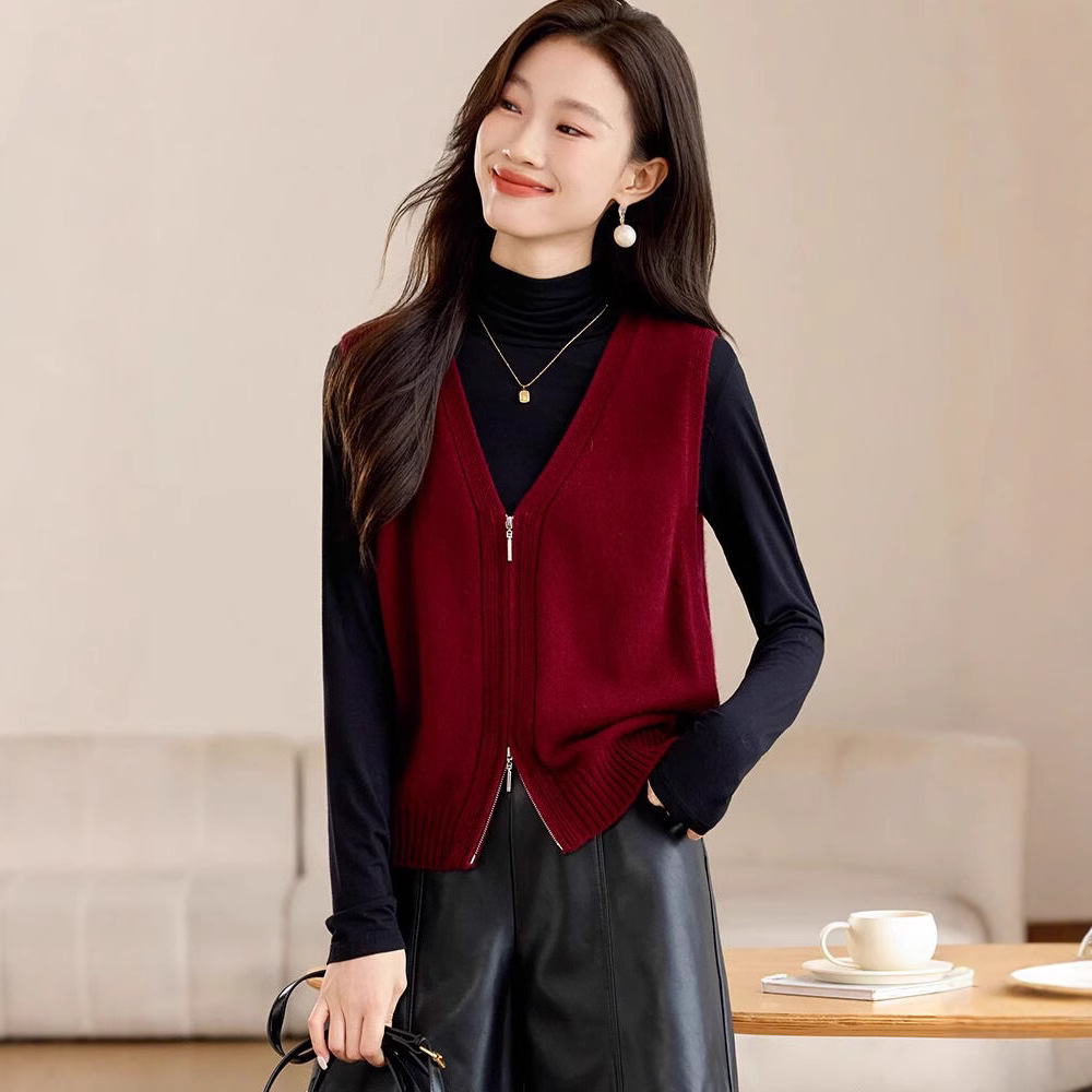 ダブルファスナーの大きいサイズのニットのベストの女性2025春の新型の小さい背の短いタイプの高級感はベストの上着を重ねて着ます。