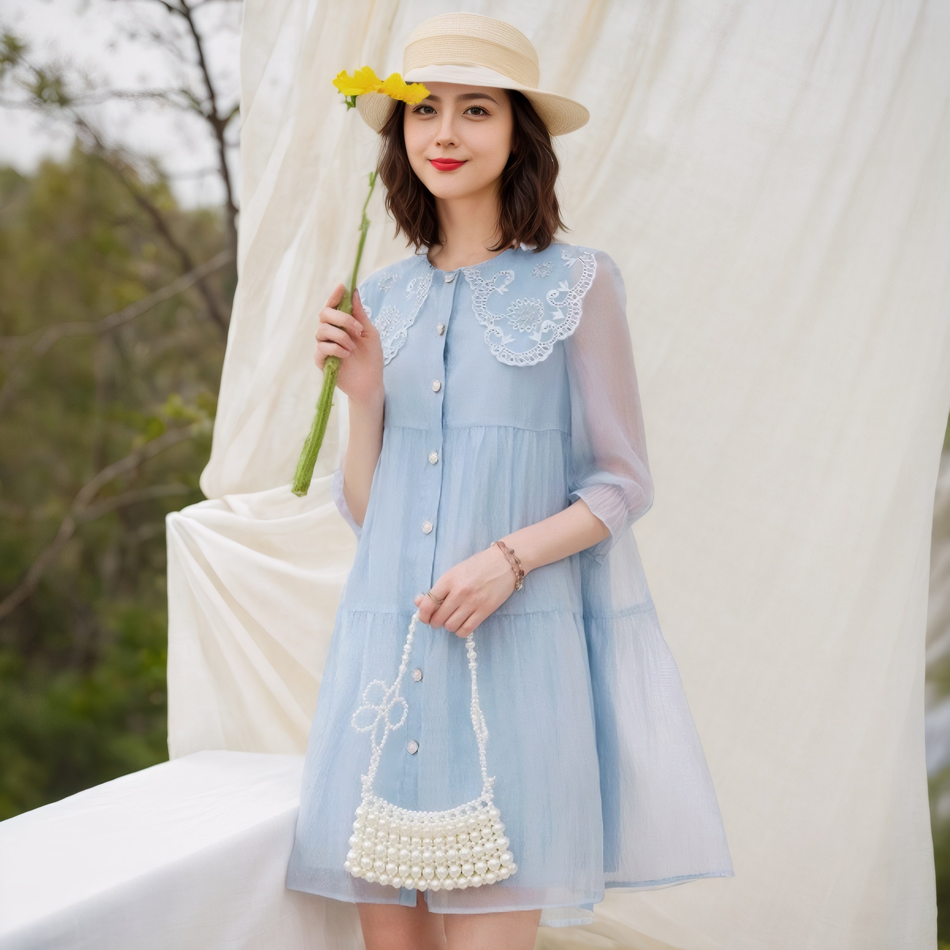 2025春夏新作刺繍子供襟釘珠a字スカートは真珠ボタンをまねて立体光沢感のワンピースを飾ります。