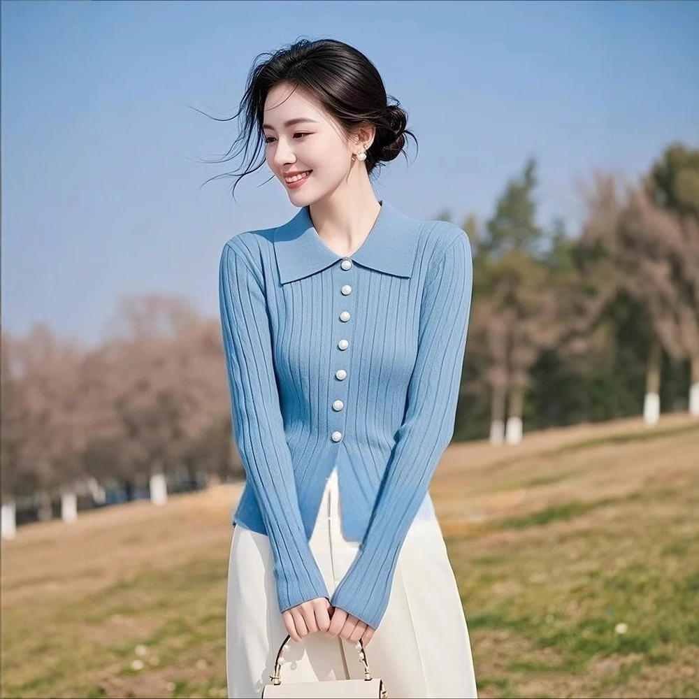 韩系小香风折り襟セーター2025春新作ファッション通勤高级感ブルーニットトップスレディース