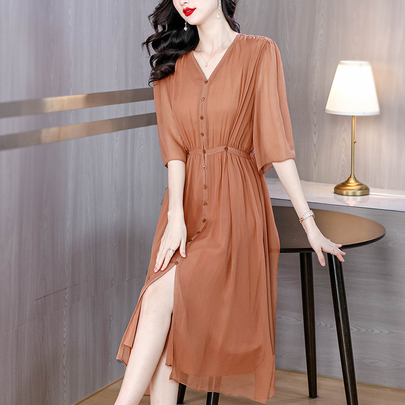 Yjr9093シンプルな雰囲気の細いvネックの痩せたワンピース女性2025春の新型の通勤中のロングスカート