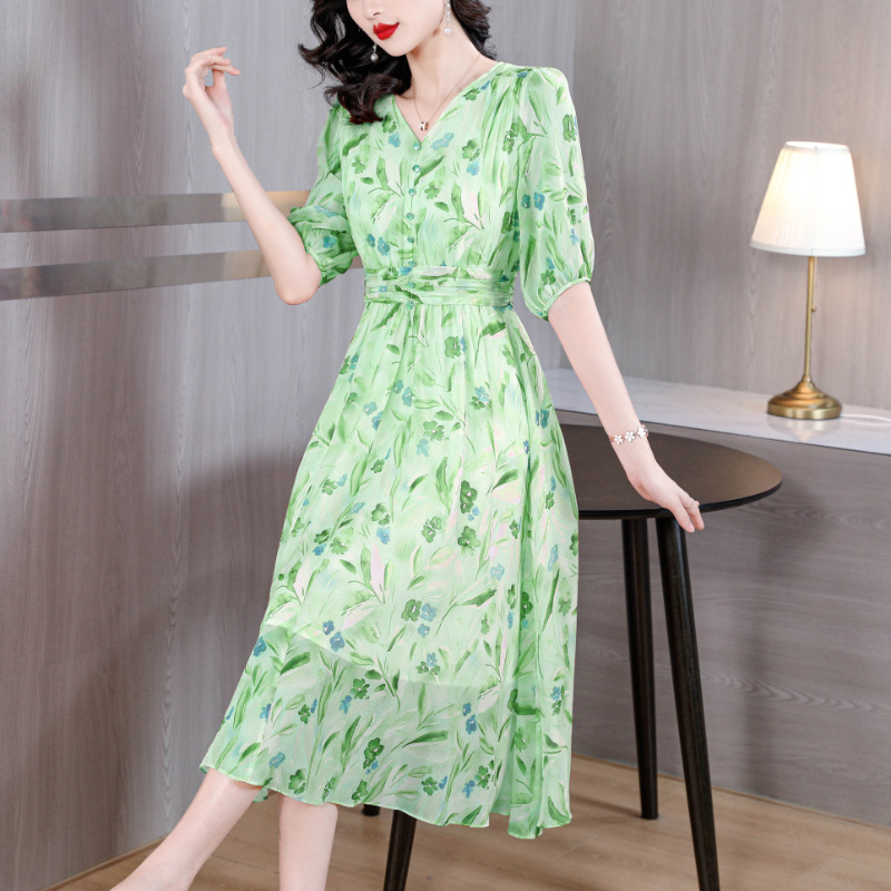 Yjr9062フランス式レトロvネック泡袖プリントワンピース