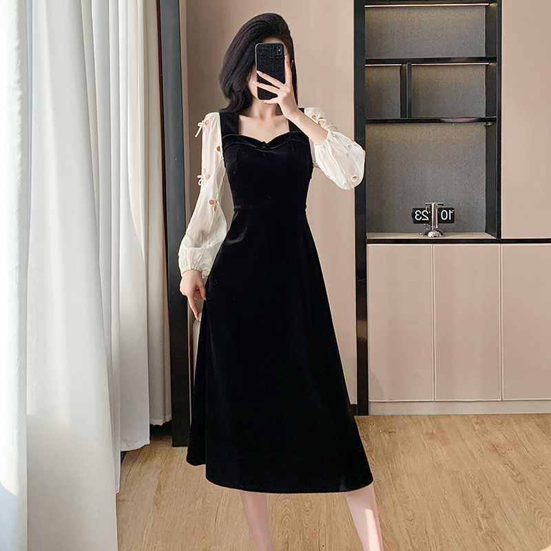 Mnnz129フレンチベルベットの襟に蝶結びの透かし彫りのワンピースの春の優雅なデザイン感の長いスカートをつなぎ合わせます。