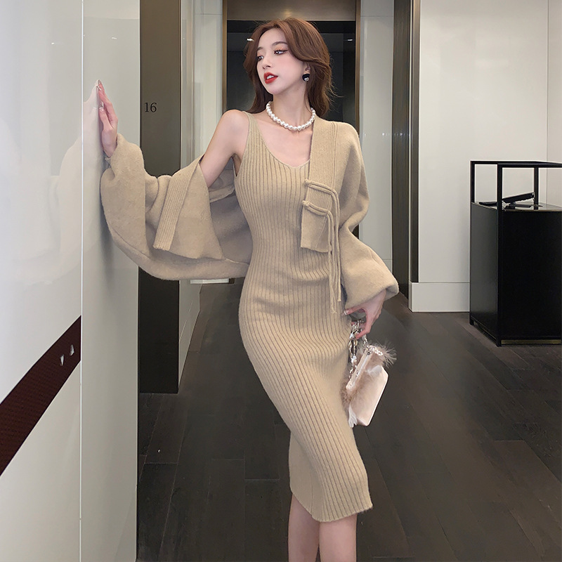 フランスの日本式レトロなニットのカーディガンのコートはお尻のワンピースのファッションの2つのセットの優しい風の小さい香りの風を包みます。