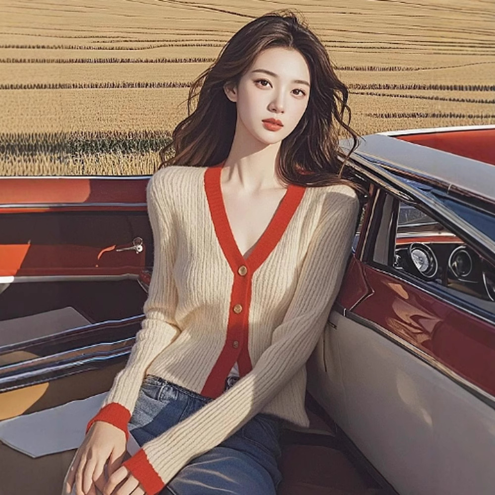 Zynz5531韓国版気質菱格レトロ杏色vネックセーター2025春新作ニットカーディガン