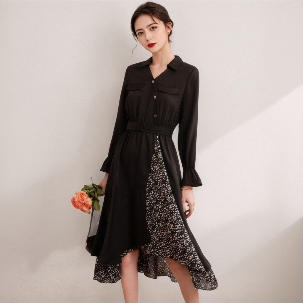 Mnm5019韓国版ベルトPOLO襟ワンピース女性2025春新作気質修身衝突シャツスカート