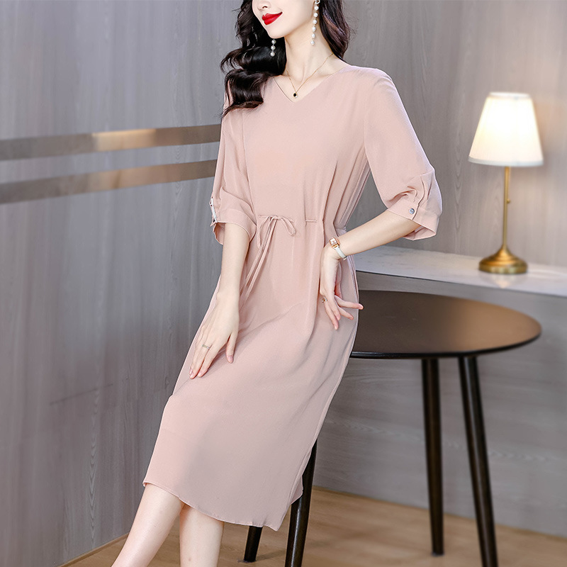 Yjr9520春夏vネック半袖ワンピース女性がゆったりとお腹を隠しています。