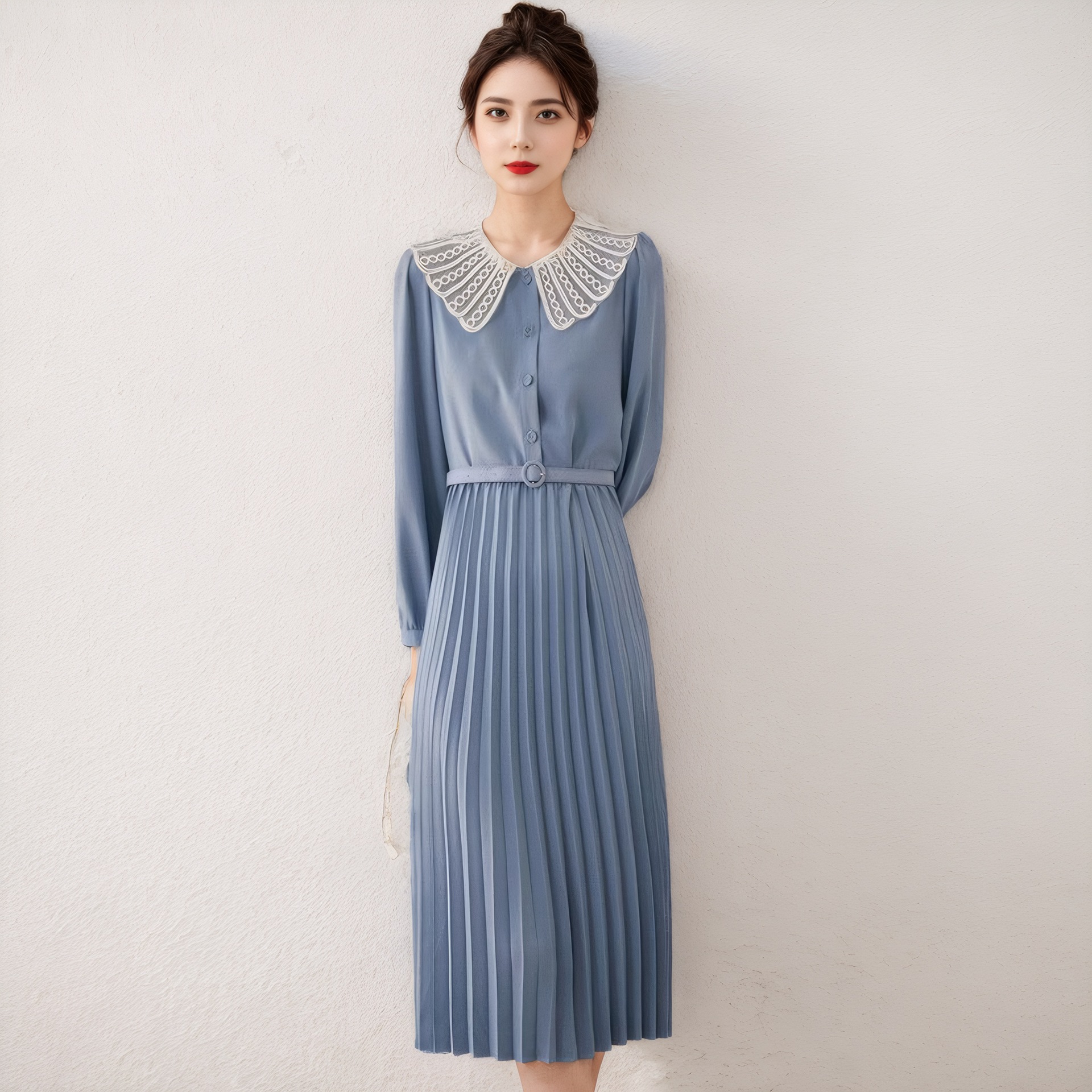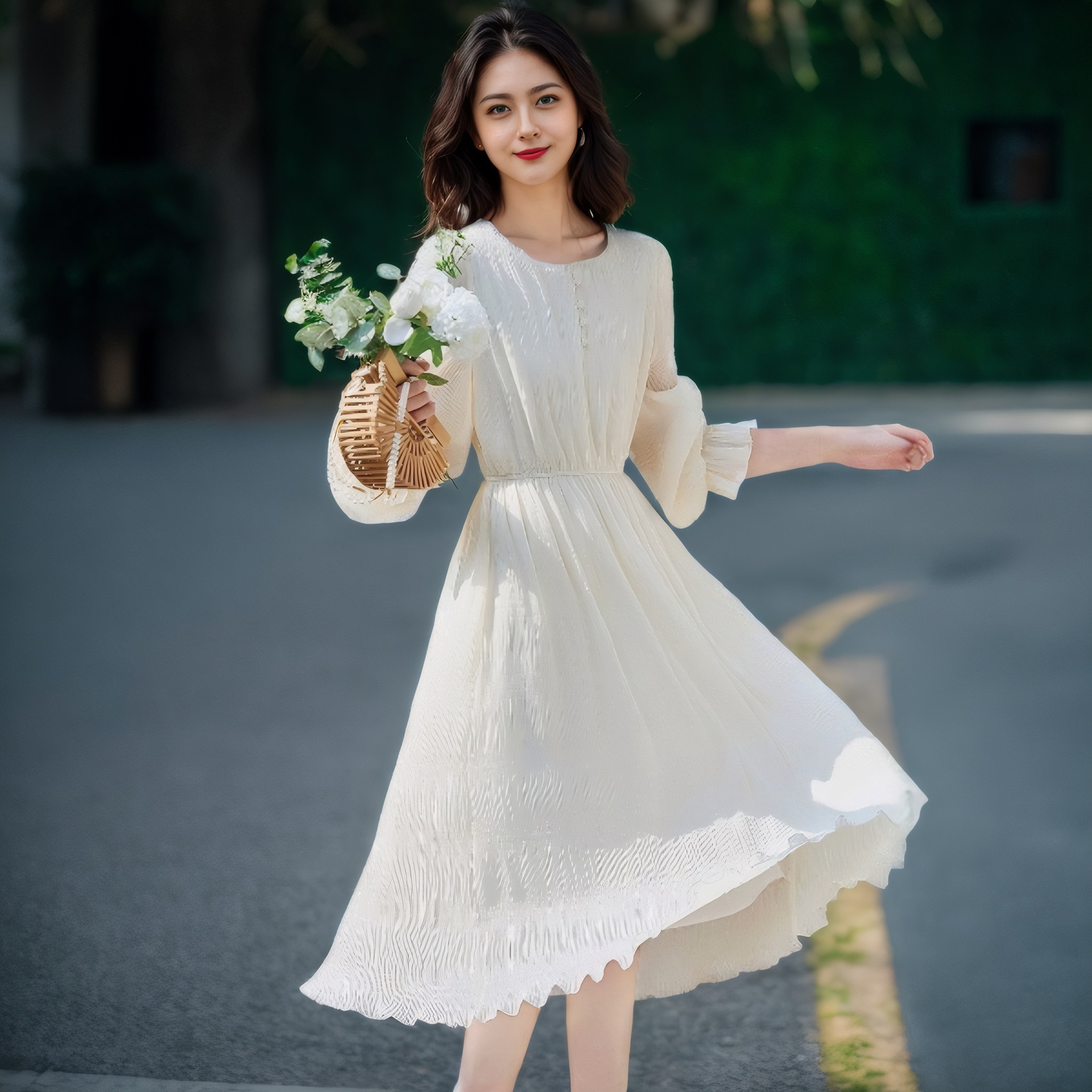 2025春夏の新型のしわの軽やかなシフォンの美しいラッパの袖の密は長袖の修身のワンピースの女性の中で長いタイプを掛けます。
