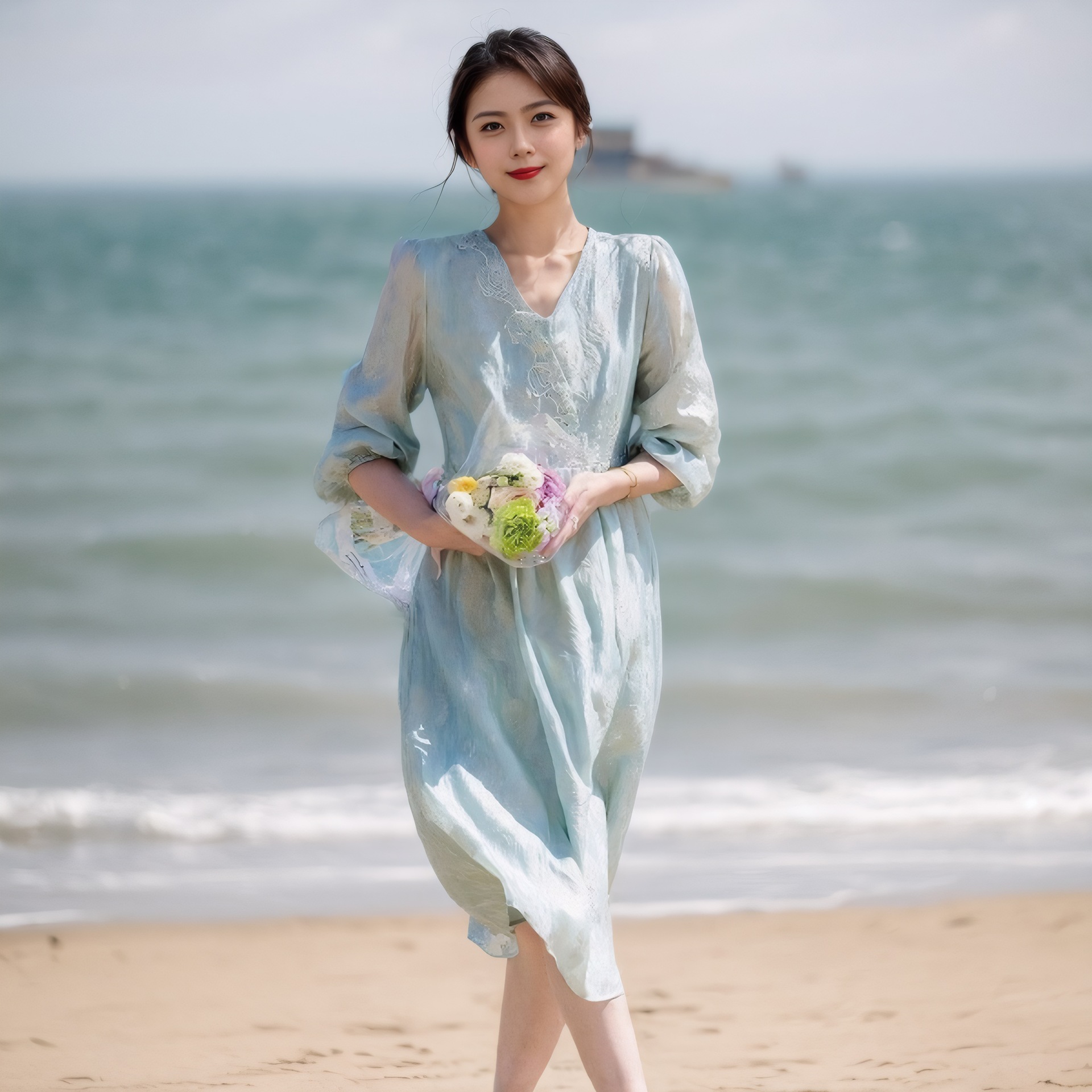 フランスvネックウエストレースジャカードリゾート風ビーチスカート2025春の新作気質ウエストワンピース女性