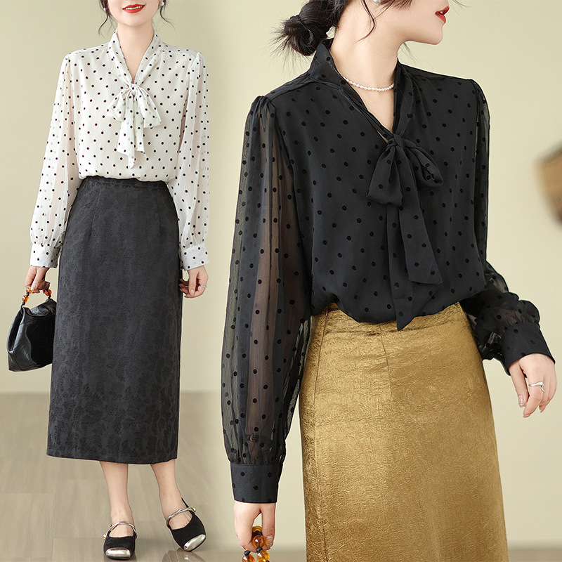 2025春の新型の大きいサイズの波点のシャツのフレンチ日焼け止めのシャツの蝶結びは泡の袖の気質の上着を持ちます。