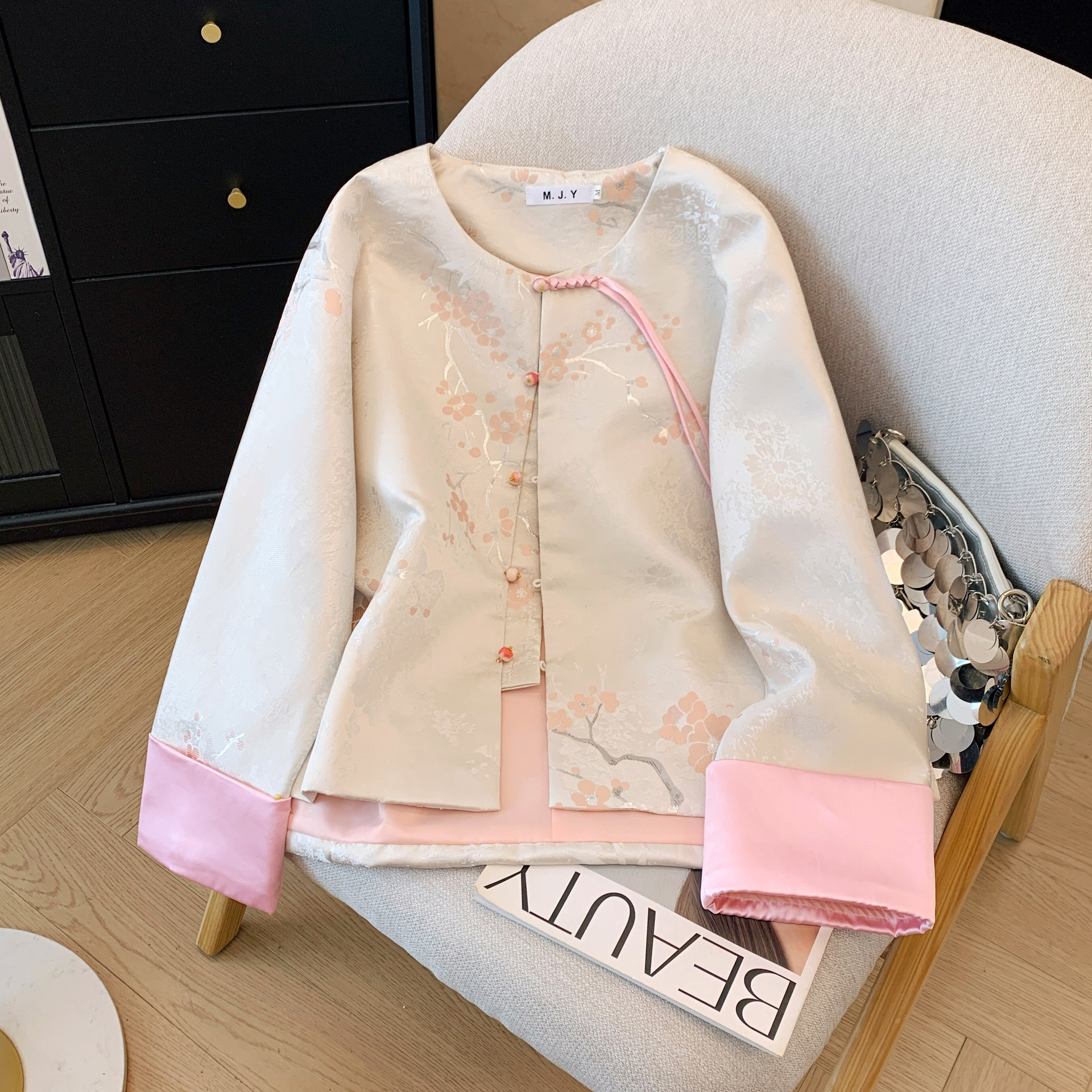 中国風織錦唐装上着女性2025春の新デザイン感新中国式盤ボタンの短いゆるいコート
