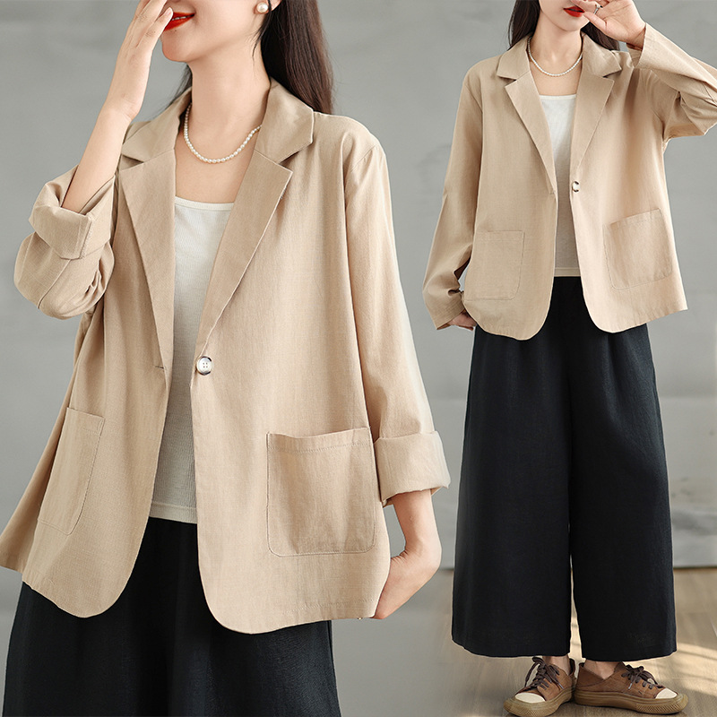 大きいサイズの婦人服2025春の新型のゆったりした純色のカジュアルな綿麻のスーツのコートのファッション的な百合の通勤上着