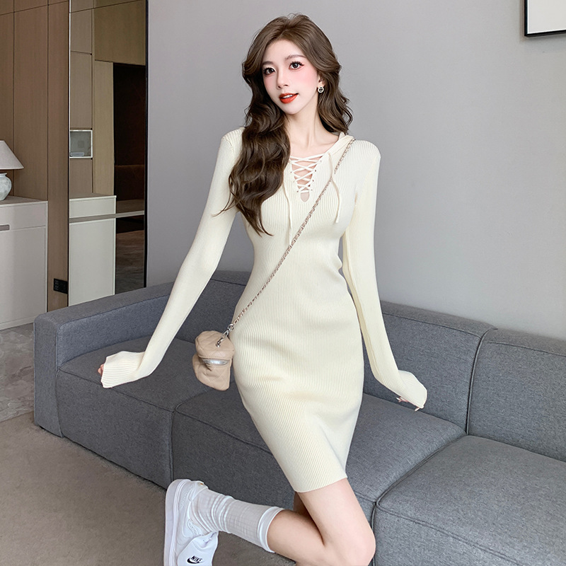 ギャルのデザイン感のあるストラップと帽子付きのヒップスカート2025春の新型のスリムな長袖ニットワンピース女性
