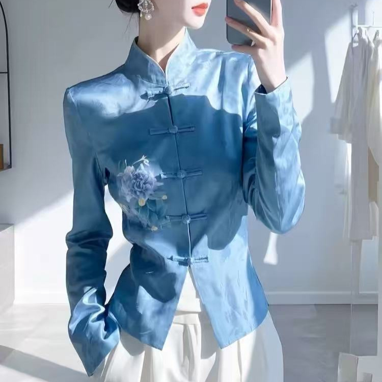 新中国式レトロ盤バックル唐装上着2025春の新型ファッション気質は腰の国風の青いシャツの女性を収めます。