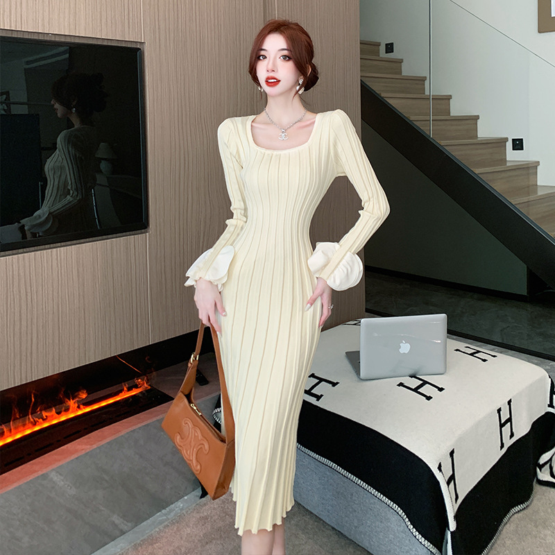 長袖の方襟のお尻のスカートの春の気質の名媛の修身のニットのスカートの女性のフランス式の富家の小さい娘のワンピース