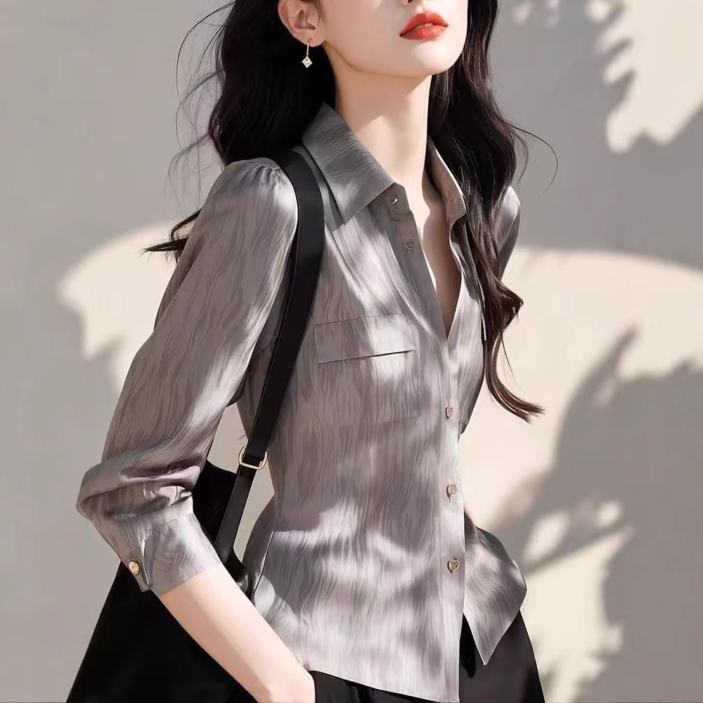 フランスの年齢を減らす気質の小さい大衆の灰色のシャツの女性の2025春の新型のファッションの優雅な通勤の職場のシャツ
