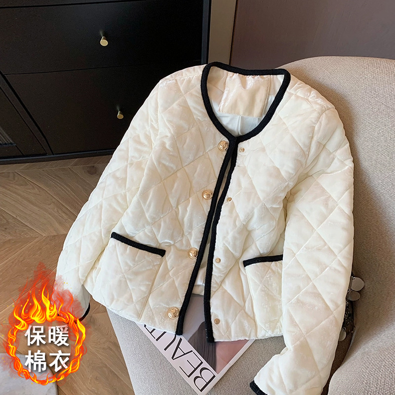黒い綿を挟んだ金のベルベットの短いコートの女性は冬に2024の新しいデザイン感が痩せた気質を見せて上着を厚くする