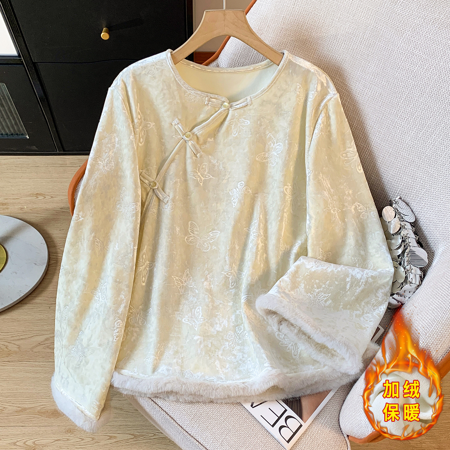 高級感のある白いベルベットの上着の女性は秋冬にベルベットを厚くしてシャツの新中国風の中にミンクの毛をつけた