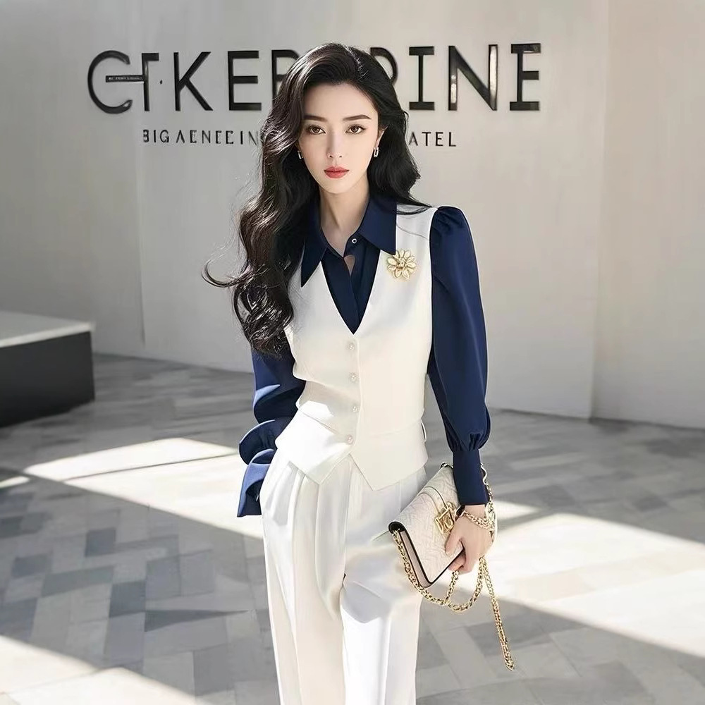 早春は小柄な高級感のお姉さんの気質の偽の2つのシャツのズボンの職業の2つのセットを着ます。