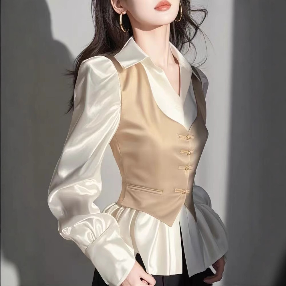 新中国式の国風の中で底のシャツの女性の2025春の新型の高級感は腰のカーキ色の偽の2つのシャツを収めます。