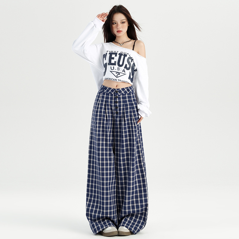 レトロな青い格子のカジュアルなワイドパンツの女性2024秋冬の韓国系の怠惰な感覚がボタンダウン感を引きずっている