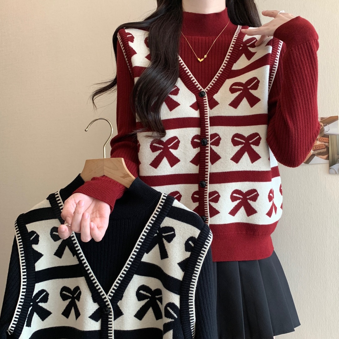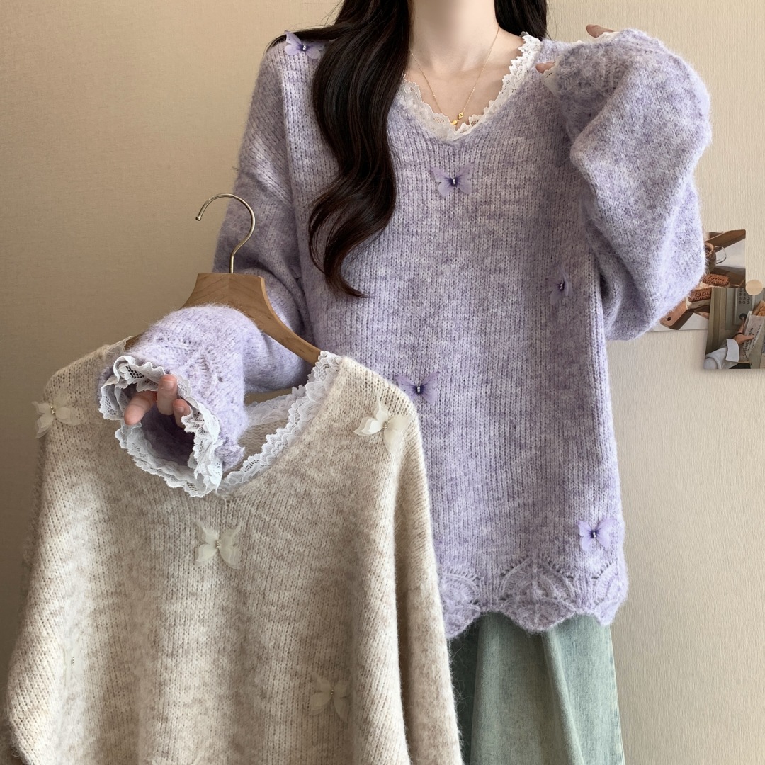 大きいサイズの婦人服の2024秋冬の新型vネックのレースは蝶のニットのセーターのファッションの洋風の底のシャツをつなぎ合わせます。